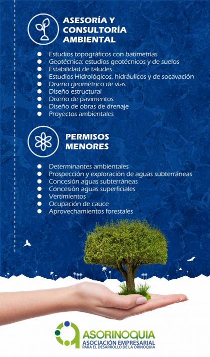 La Asociación Asorinoquia presenta a los empresarios de la región, tanto a los afiliados como a los No afiliados, nuestra Unidad de Gestión Ambiental, creada para ofrecerles soluciones a los requerimientos en cuanto a diseño y formulación de los estudios requeridos por las autoridades competentes en la región de la Orinoquia para la consecución de permisos ambientales y de todos los trámites conexos.